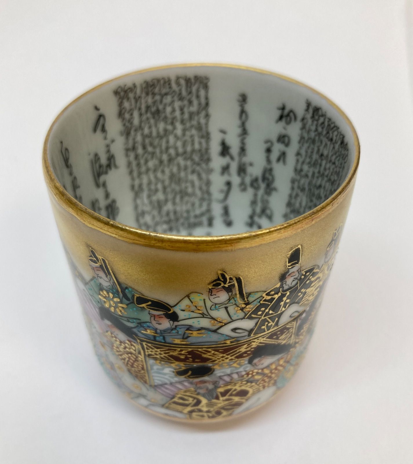 九谷焼 金彩 三十六歌仙 細字 蓋付 夫婦湯呑み2客