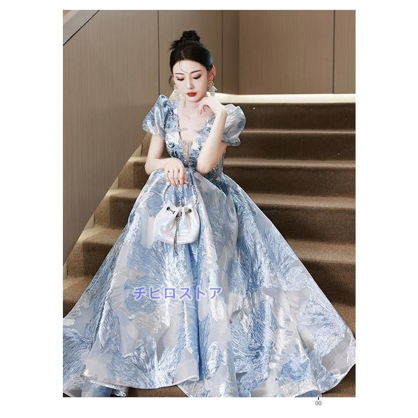 ロングドレス 演奏会 ピアノ 発表会 キラキラ スパンコール 花刺繍 花柄 レース ブルードレス 袖あり 5分袖 フェミニン エレガント大きいサイズ