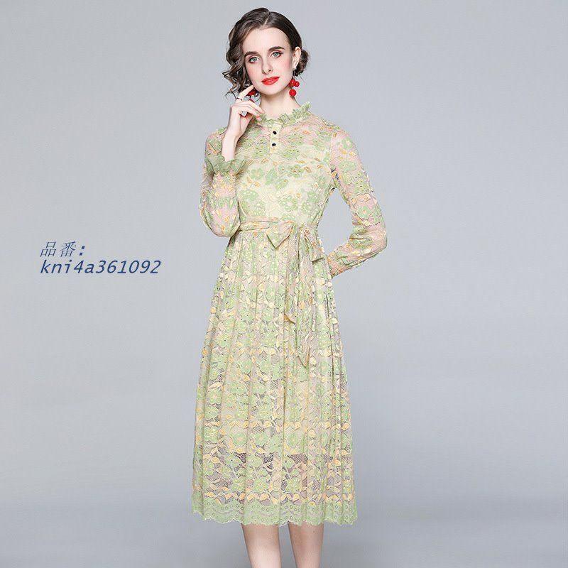 新着 ワンピース S-3 L 総レース 襟元フリル 長袖 結婚式 202112 ロング 袖口幅広シャーリング おでかけ ウエストリボン パーティ 202111 kni 4 a 361092