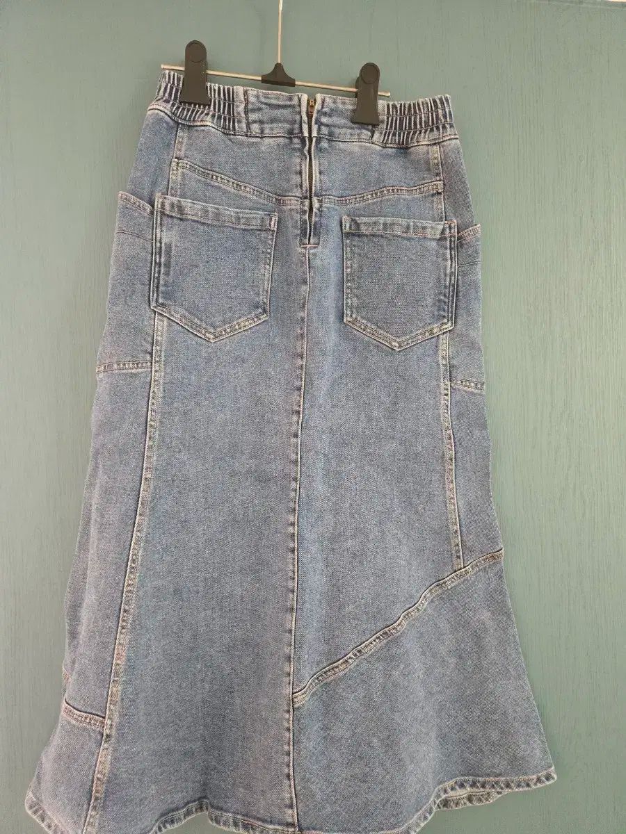 オズセカンドデニムのロングスカートが販売されています。フロントのボタンがアクセントになったデザインが特徴です。ウエストバンドで着るも楽になります。