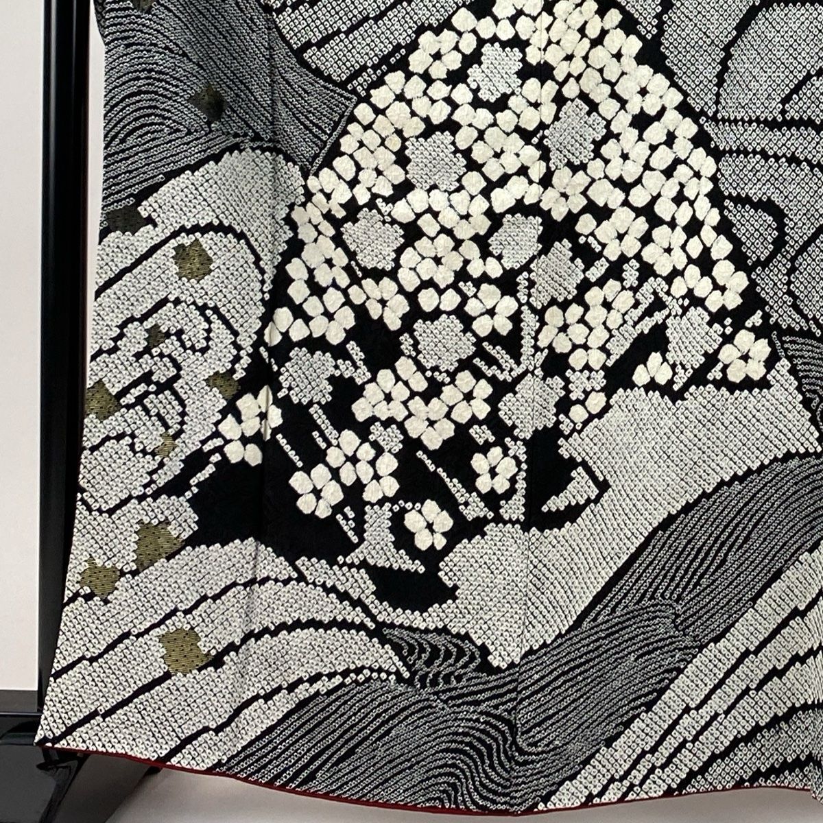 表地所々白い絞り部分に薄いシミ、表地所々に金彩の変色がございます。