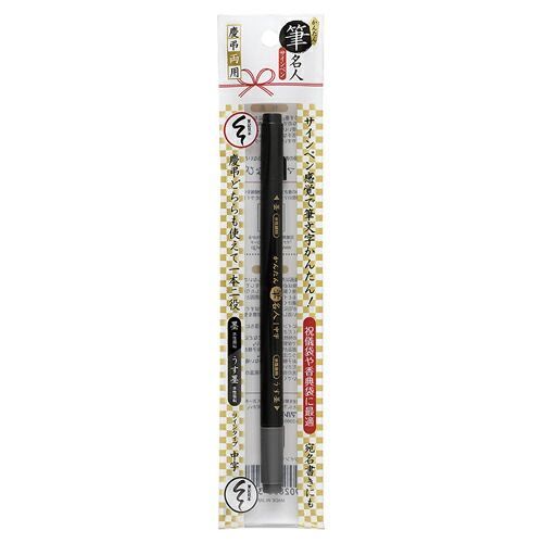 <慶弔どちらにも使えて一本二役>「墨」「うす墨」がツインになった慶弔両用なので、お祝いにもお悔やみにもお使いいただけます。<サインペン感覚で筆文字かんたん!>毛筆が苦手な方や不慣れな方でも筆文字が書きやすいサインペンタイプです。パッケージにのし袋の書き方がわかる「マナーなび」QRコード付。製品寸法:W10×H160mm、パッケージ寸法:W45×H216mm。1本入【検索ハッシュタグ】#ふでぺん#筆ペン
