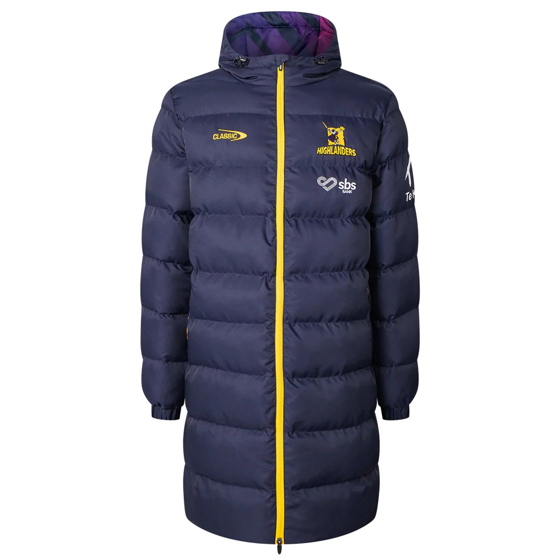 トグル留め具付きの裏地付きフードと、保温性を高めるキルティング裏地が付いています。左胸にチームロゴがあしらわれています。