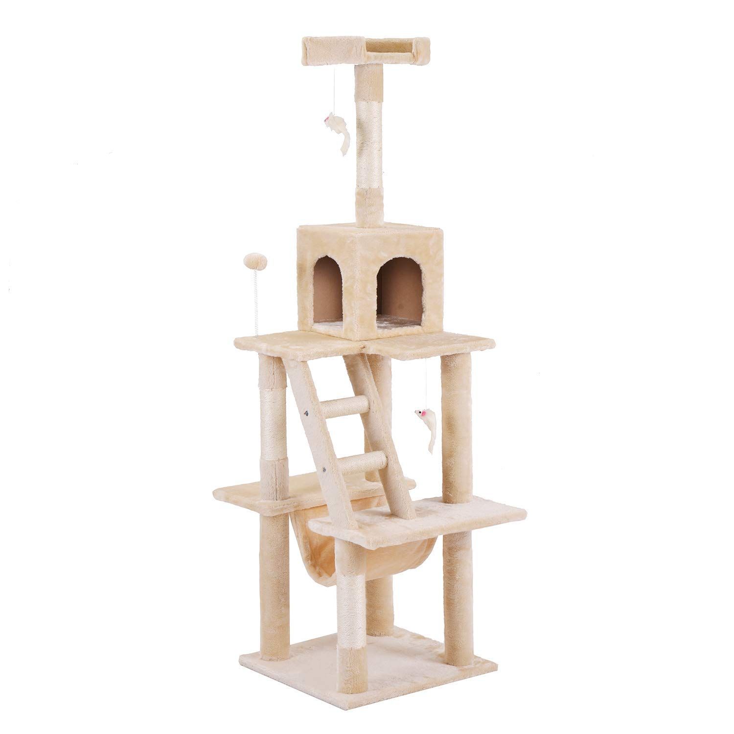 ベージュ OSJ オーエスジェイ キャットタワー 据え置き シニア 省スペース 全高155 cm 麻紐 おしゃれ ネズミおもちゃ2本付き ボンボンおもちゃ付き 爪とぎ 猫タワー ペット用品 運動不足解消 ストレス解消 組み立て簡単