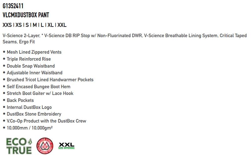 こうして完成したDustbox Pantは、スタイルと自由な動きを最大限に引き出すフィット感を備えた、彼らのシグネチャー・パンツです。ストリートからバックカントリーまで対応するV-サイエンス2レイヤーのアウターと、メッシュのジッパー付きベンチレーションなどテクニカルな機能を備え、DUSTの刺繍でスタイリッシュに仕上げています。