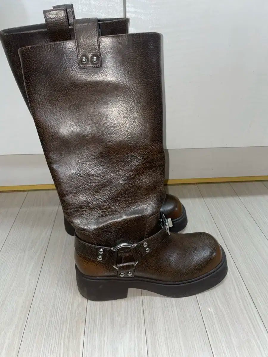 香港ブランド woomii ジャネット ブラウン バーニッシュド ウォーカーブーツ EU38 サイズです。銀色のバックル ディテールが POINT ポイントとして入った 商品です。ヒールも 程度 あるので 厚底 効果もあります。