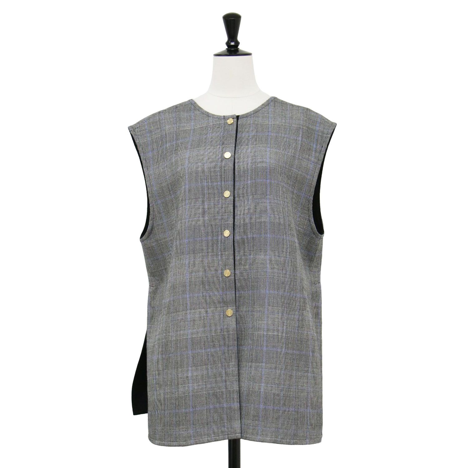 collection トゥモローランド ベスト グレー系×ブラック サイズ 36 9号 22秋冬 ウール シルク ブロックトゥース 4 WAY ジレ Vネック チェック柄 ワイド 金ボタン レディース