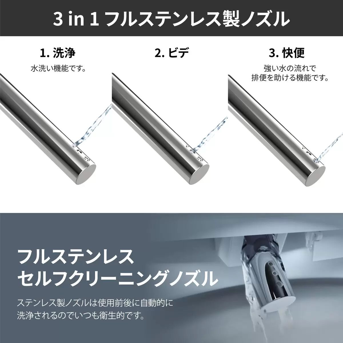 全スタンノズル – 女性らしい機能、後方機能、TURBO WASH機能、リズム感のある動き、5つのノズル位置、ワンタッチ、セルフクリーニング、半永久的なノズルを使用