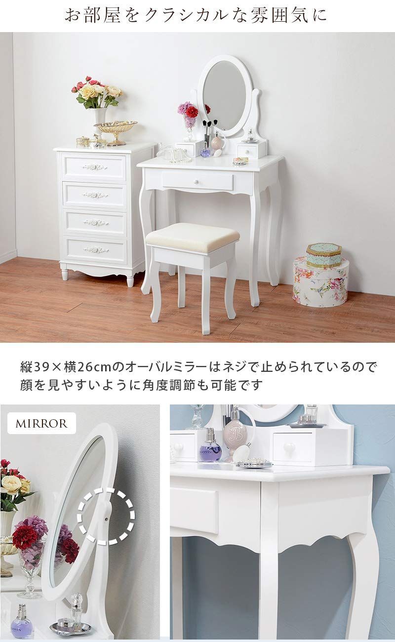 女性らしく優雅なフォルムがロマンティックなお部屋にしてくれるドレッサー。 小さな頃からの憧れを形にしたようなデザインは、メイクの度に気分が上がります。 コンパクトなサイズなので一人暮らしやワンルームの方におすすめ。 ■サイズ: 【本体】(約)幅70×奥行40×高さ130cm 【スツール】(約)幅37×奥行29×高さ45cm 【ミラー】(約)横26×縦39cm ※サイズは目安になります。 ■素材:MDF ■お客様組立品