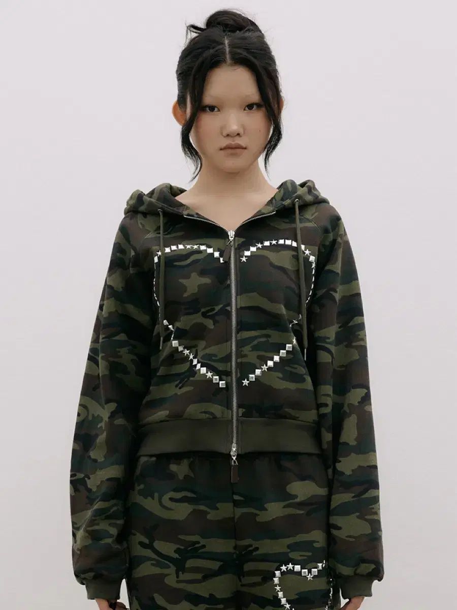 EXPIRED GIRL ハート スタッズ フーディー ジップアップ カモ