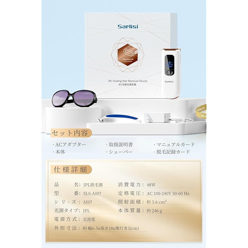 商品名:即納:Sarlisi 脱毛器 全身脱毛 【新モデル】 冷感脱毛 IPL光脱毛器 家庭用 9段階調節 99万回照射 連続照射 光脱毛器 光エステ 男女兼用 だつもうきメンズ 髭 無痛脱毛 軽量 VIO対応 手動/自動モード 光美容器 Ai07-1