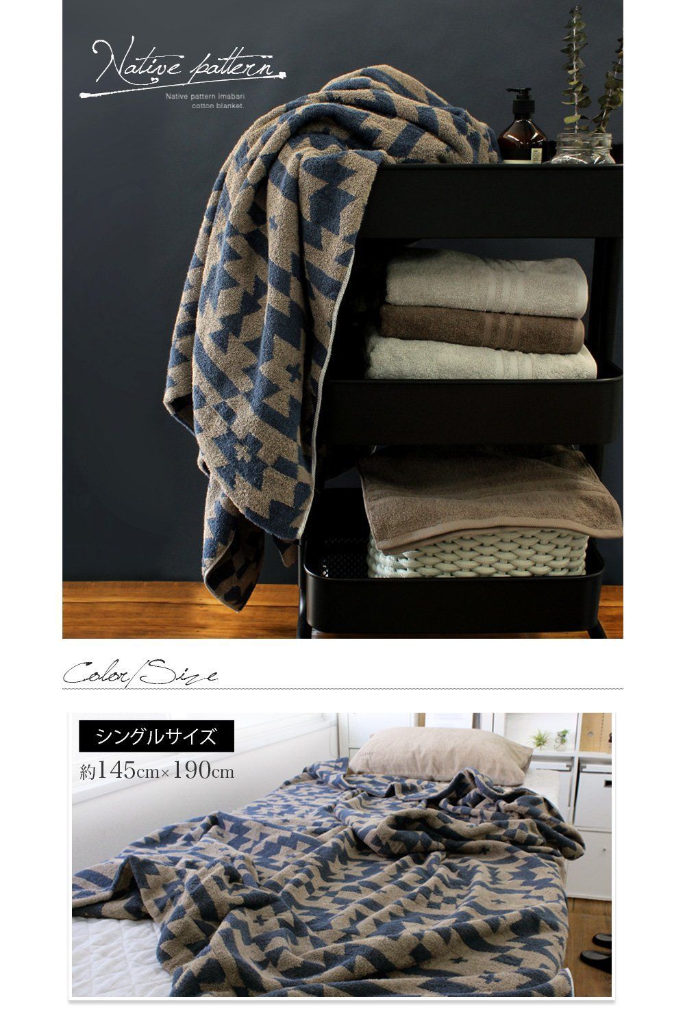 【柔らかな肌触り】毎日使うものだからこだわりたい、安心の今治ブランドのタオルケットです。今治産地ならではの高い技術を駆使し、当店オリジナルデザインの「ネイティブ柄」に織り上げました。ボリュームを持たせて、ふんわりと弾力を感じる風合いに仕上げています。
