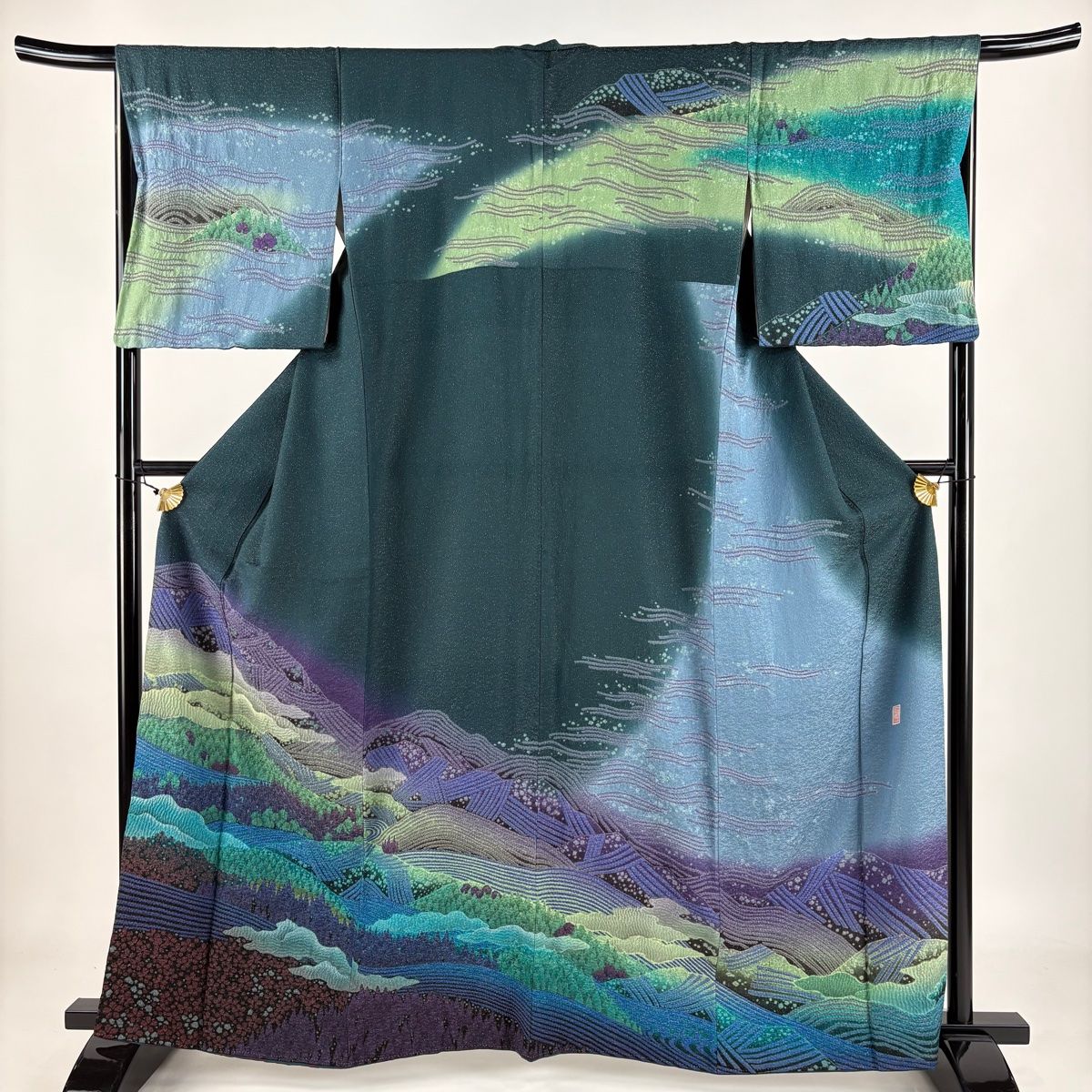 訪問着 身丈164 cm 裄丈67 M 袷 滝泰 落款 風景 樹木 金通し 絞り 深緑 正絹