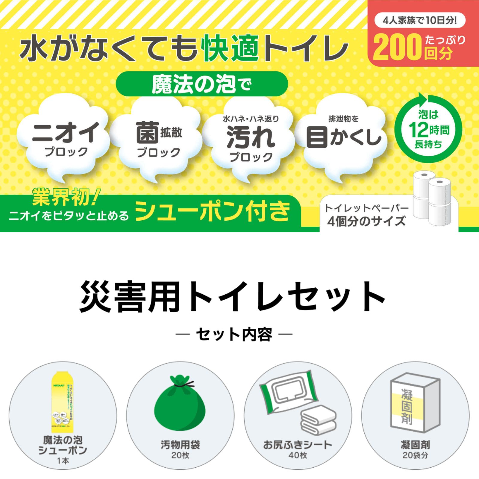 ニコラス 災害用トイレセット200回分 36円~70円 回 強力消臭泡スプレー シューポン 付 簡易トイレ 防災グッズ 非常用 凝固剤 携帯トイレ コンパクト 消臭 ポータブルトイレ 大口対応 アウトドア 介護用 避難