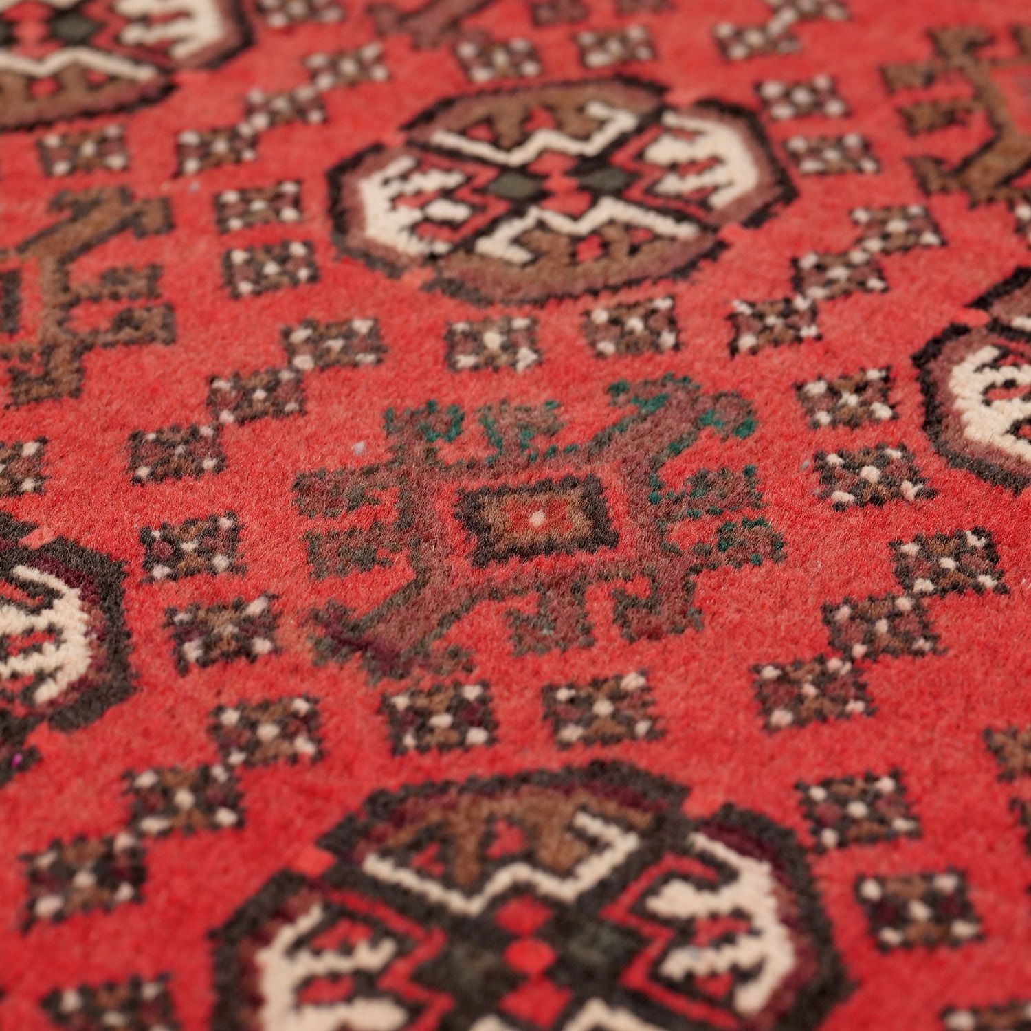 1960年代に制作されたザーボル産のセミアンティークラグです。赤のフィールドに規則正しく並んだテケギュル文様が力強さと落ち着きを兼ね備えています。周囲には小文様が加えられ、伝統的な構成美を際立たせています。大判サイズのため、リビングや応接空間などで主役となる一枚です。