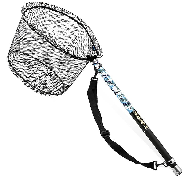 ??【持ち運び便利】伸縮式の玉の柄と着脱式の網は、コンパクトに収納することができて、さらに肩掛けベルト付きで、お持ち運びにも楽々。荒磯・漁港・防波堤など移動が多い磯釣りや川釣りに最適なランディングネットです。