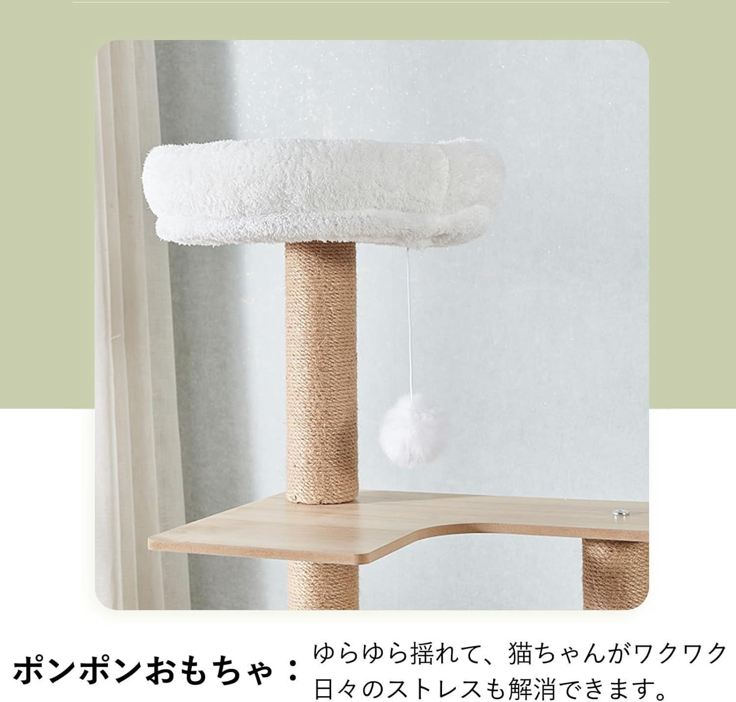 【良い素材・商品仕様】本体高さ165cm(約)、幅60×奥行き40cm。匂いなくて自然の素材で猫ちゃんの安心環境を作ってあげて、品質がある上に、部屋のインテリアとしてもピッタリの可愛いキャットランドです。質感あるの木材を使用し、お手入れはとても楽です。夏でも冬でもご利用頂けます。 使用目安:3匹程度。組立時間約20-30分。(ご注意:1週間に1回程度、支柱部分のネジ止めがゆるんでいないか点検してください。)