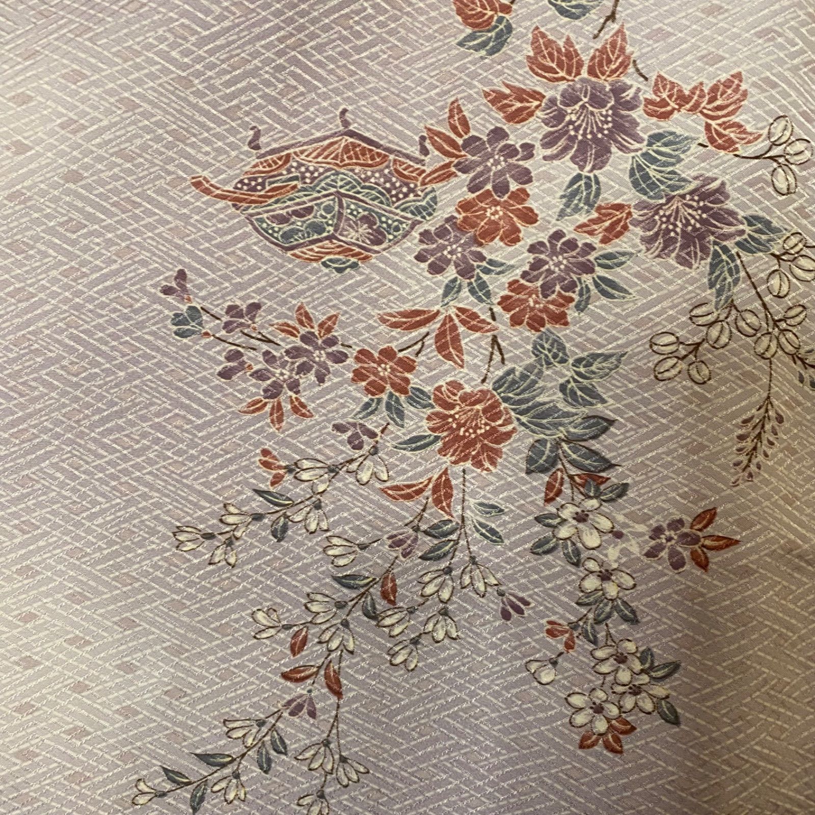 細やかな地紋がきらりと艶めく、くすみラベンダーの着物地を主役にした一点物ワンピース。落ち着いた赤紫・錆朱・翡翠色で描かれた小花と雅なモチーフが、甘さと品の良さを両立します。差し色のワインレッド帯ベルトにアイレットを配し、帯締め風の桃色紐タッセルを通して結ぶと、デイリーのお出かけから観劇・お茶会・撮影まで、季節を問わず上品に映えます。着物地ならではの味わいも魅力の、世界に一着のリメイクアイテム。