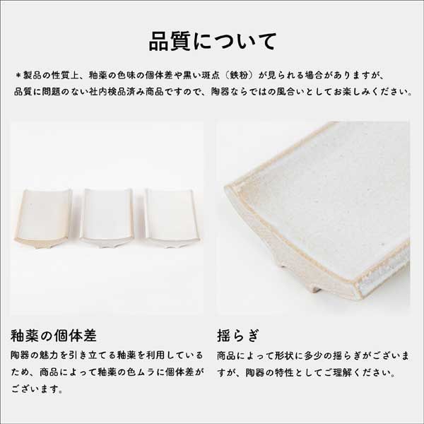 ・やきものの性質上、鉄、ピンホール、釉薬ハガレ、釉薬表情の違い、色ムラ(濃淡)、細かなキズ、ゆがみ、ガタ付き等が生じる場合がございますがメーカー検品済みですので、風合いとしてお楽しみください。
