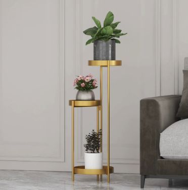 高級感あふれるゴールドフレームで仕上げた、洗練された3段式のプラントスタンド兼花台です。リビングや玄関、オフィスなど、どんな空間でも植物や小物を上品にディスプレイできます。