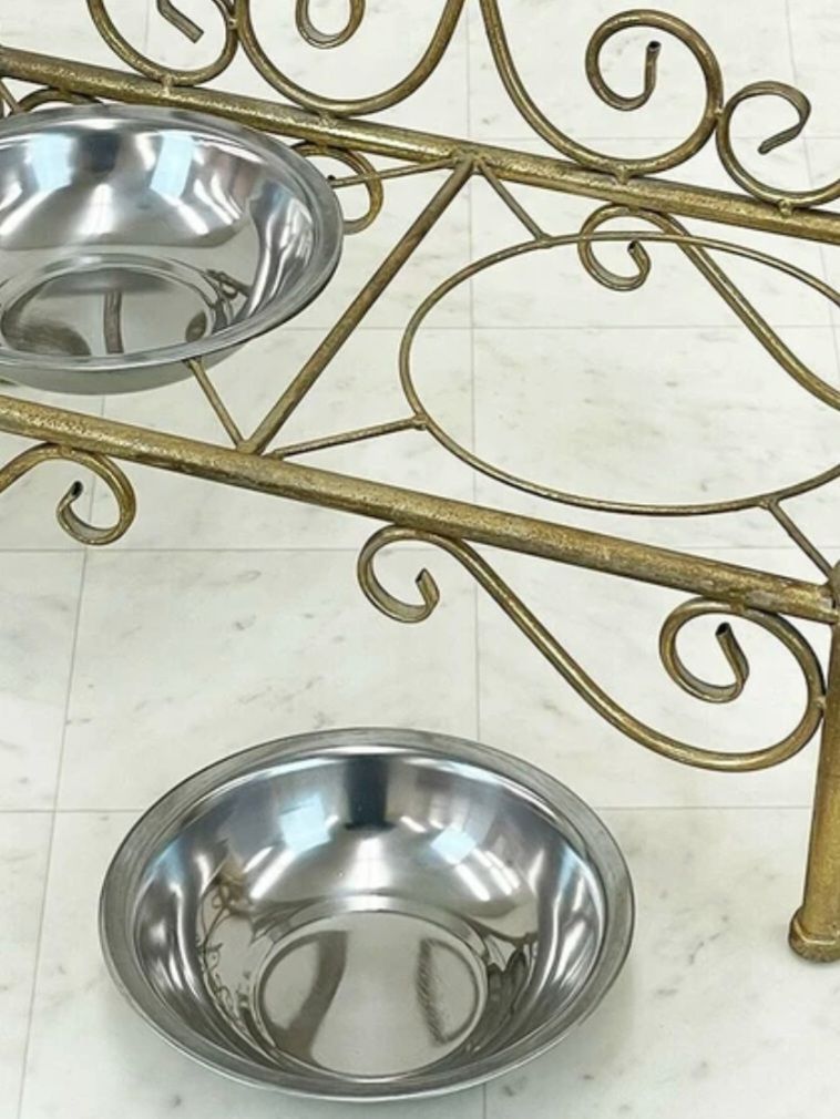 アンティークゴールドフィニッシュが施されたペットボウルスタンドは、ペットの食事時間を優雅に演出します。