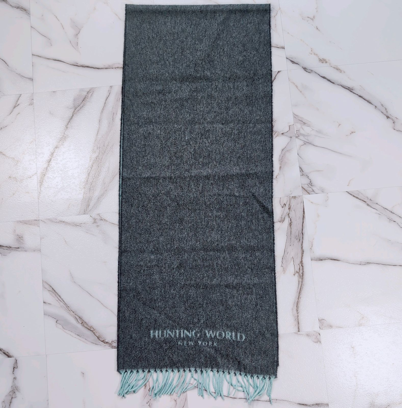 HUNTING WORLD イタリア製 カシミヤ マフラー グレー×ミントグリーン ロゴプリント リバーシブル