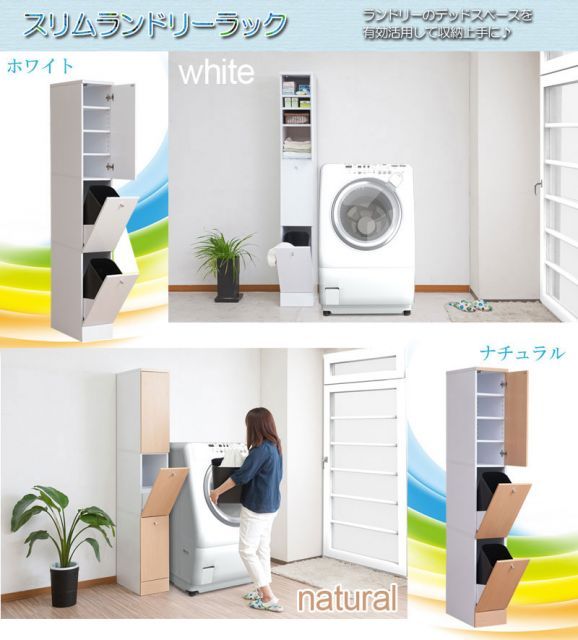 説明場所をとらない、省スペース設計の隙間収納。上部の扉はプッシュ式。また、組立時に右開き、もしくは左開きに設定できます。下部の扉は、スムーズに開閉できるフラップ式を採用。洗濯物などの出し入れが簡単。少し艶のあるホワイト。綺麗な木目のナチュラルと落ち着きのあるダークブラウンと、ランドリーの雰囲気に合わせて選べる3カラー。