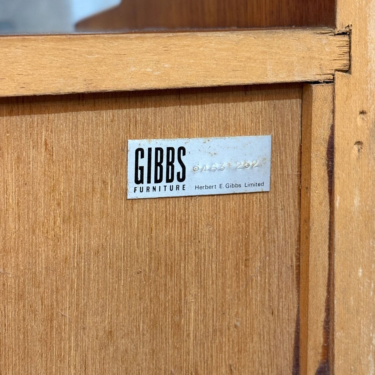 1920年ロンドン創業のギブス社は北欧スタイルに英国らしい品格を融合させた家具で知られています。製造年代の特定は困難ですがすっきりとしたデザインと丁寧な作りから1960〜70年代頃のミッドセンチュリー期に作られたものと推測されます。