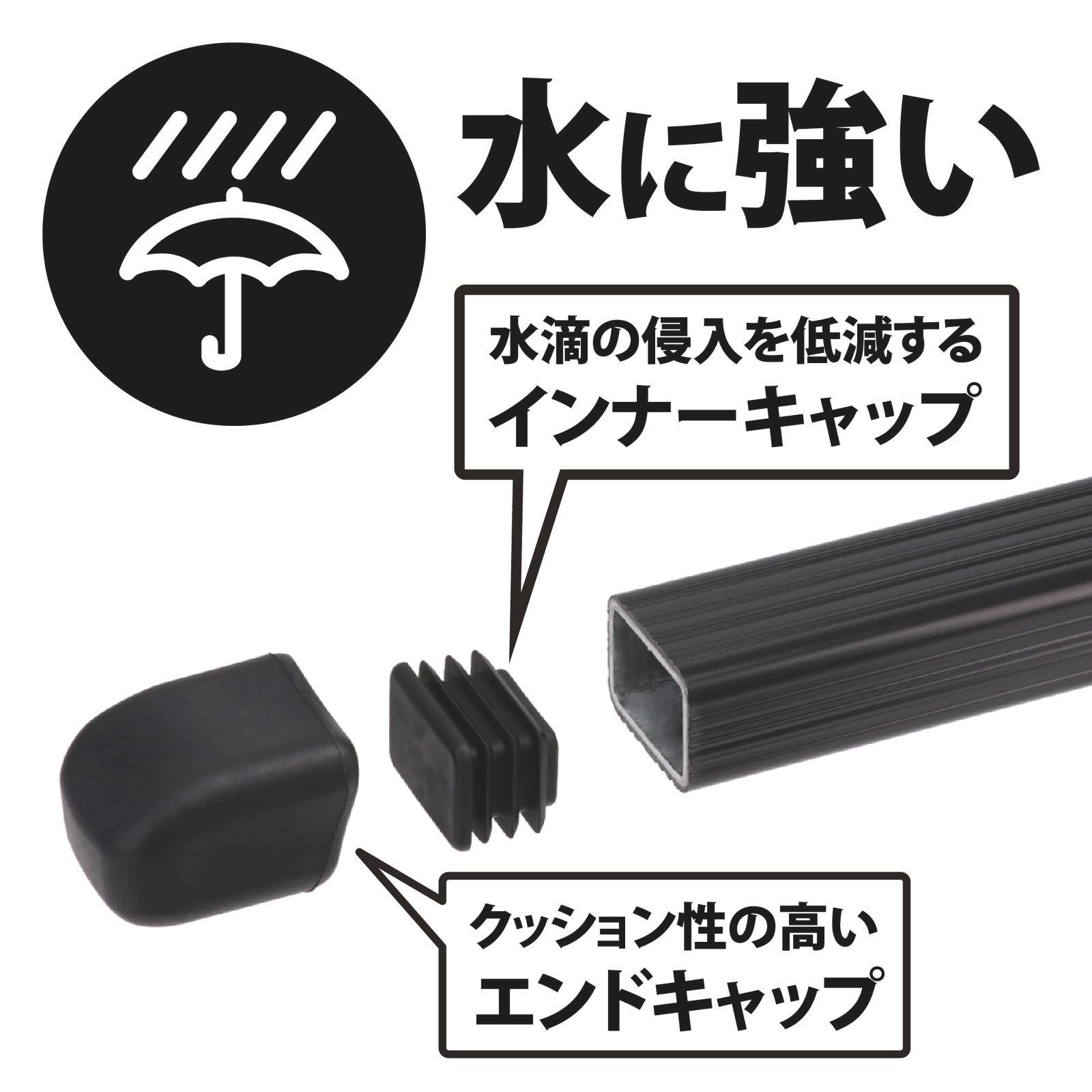 従来品同様クッション性の高いバーエンドキャップ(4ヶ)に追加でバー内側への水の侵入を防ぐインナーキャップ(4ヶ)が付属しています。