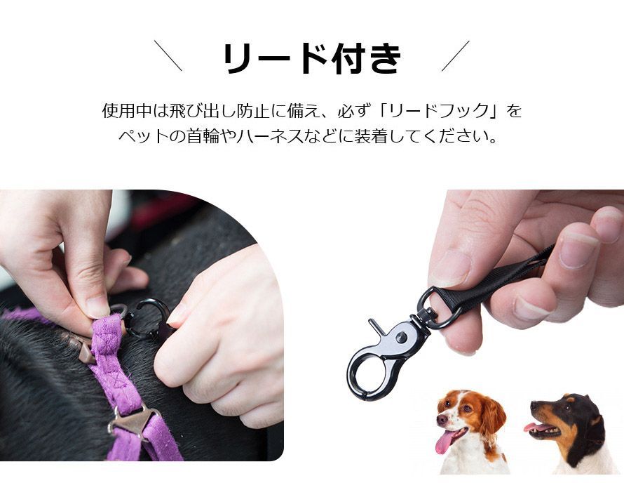 ◆ カート内部に飛び出し防止の「リードフック」2本があり、ペットの首輪やハーネスなどに装着してください。
