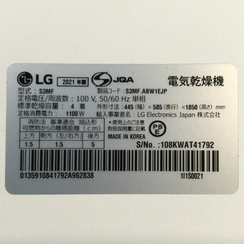 LG エルジー 乾燥機 電気式乾燥機 Styler 除菌消臭 3着モデル 衣類ケア S 3 MF