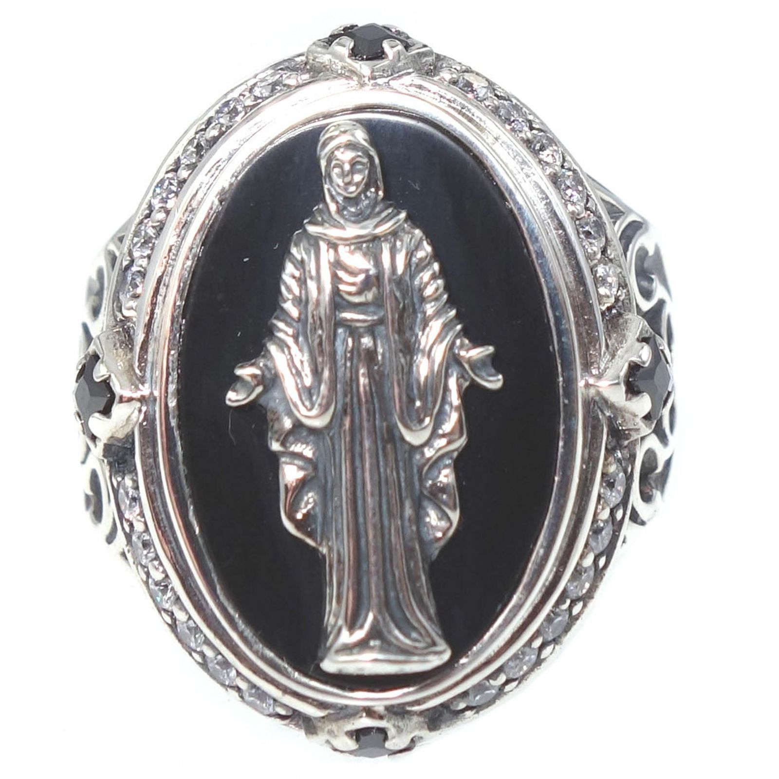 Austere and luminous, this signature ring presents a raised Madonna in sculpted sterling silver, serene against a deep black onyx ground. Every fold of the robe is rendered with crisp precision, so the figure stands as a quiet emblem of grace and protection. A halo of pavé-set clear cubic zirconia glitters like stardust, while four black CZ set at the cardinal points lend a composed, graphic contrast. Along the shoulders, fine tracery and arabesque engraving deepen the play of light and shadow, enriched by the mirror-polished and oxidized finishes of SV925. The interior is smoothly finished for effortless wear, delivering presence without compromise. Crafted in our partner atelier under the brand’s direction with time-honored savoir-faire, it’s a ring made to accompany the everyday and the ceremonial alike—an art piece to be cherished.
