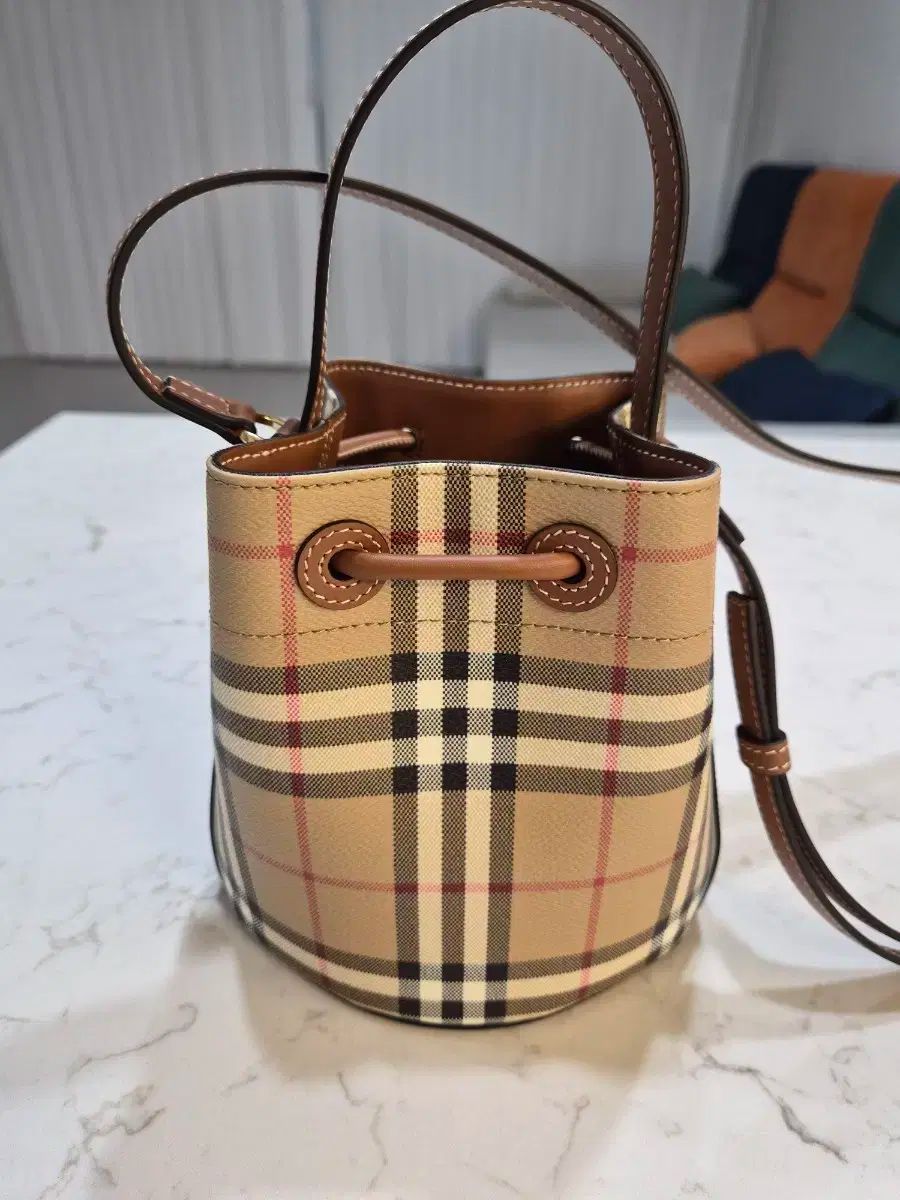 バーバリーシグネチャーチェック柄のバケットバッグです。クロスボディバッグとしても使えますし、