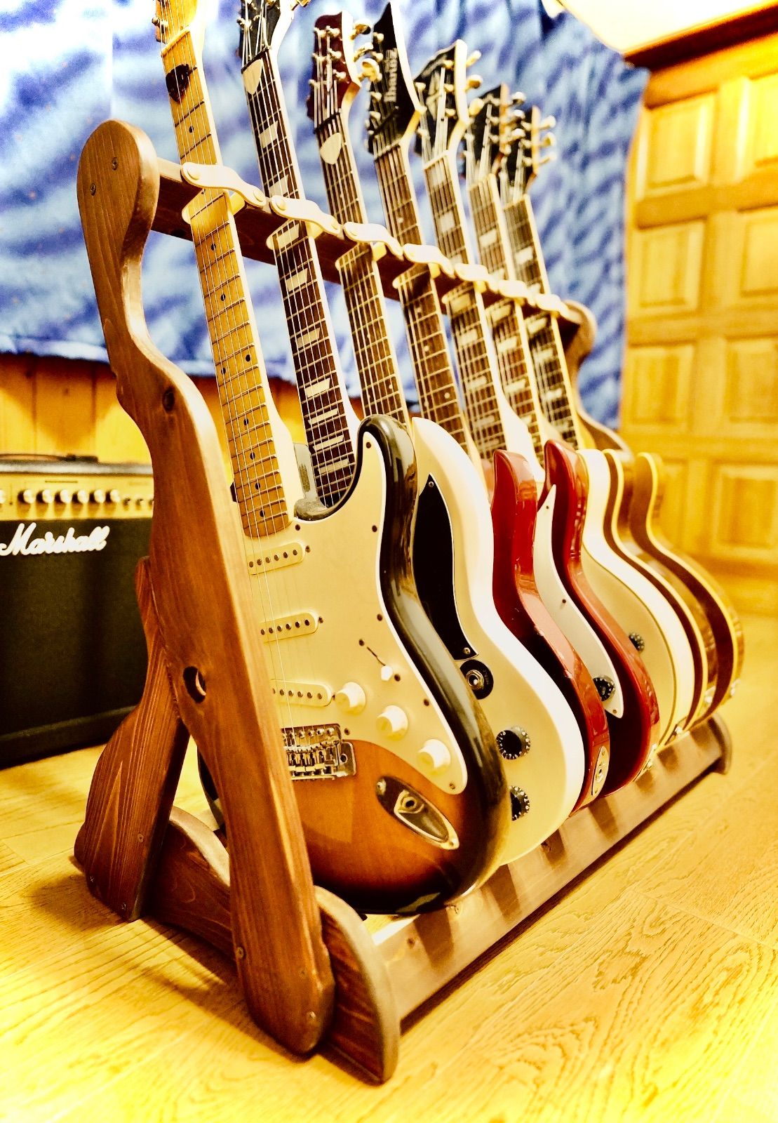 24時間以内に発送 手作り木工 木製ギタースタンド ニス仕上げ キャスター 転倒防止ベルト