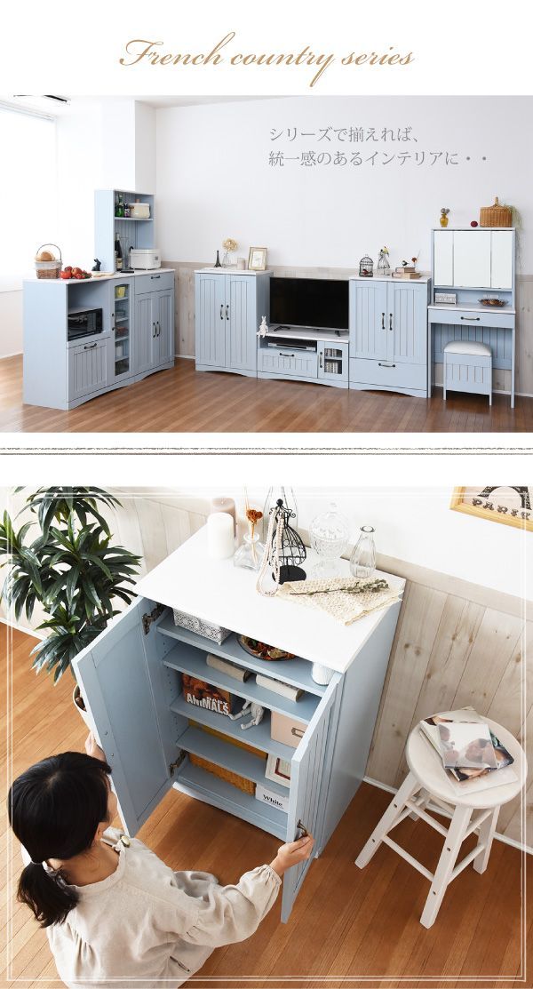 ♪フレンチカントリー調 扉付きキャビネット 幅60 cm リビングキャビネット リビング収納 収納家具 1人暮らし ワンルーム カントリー ブルー 水色 姫系