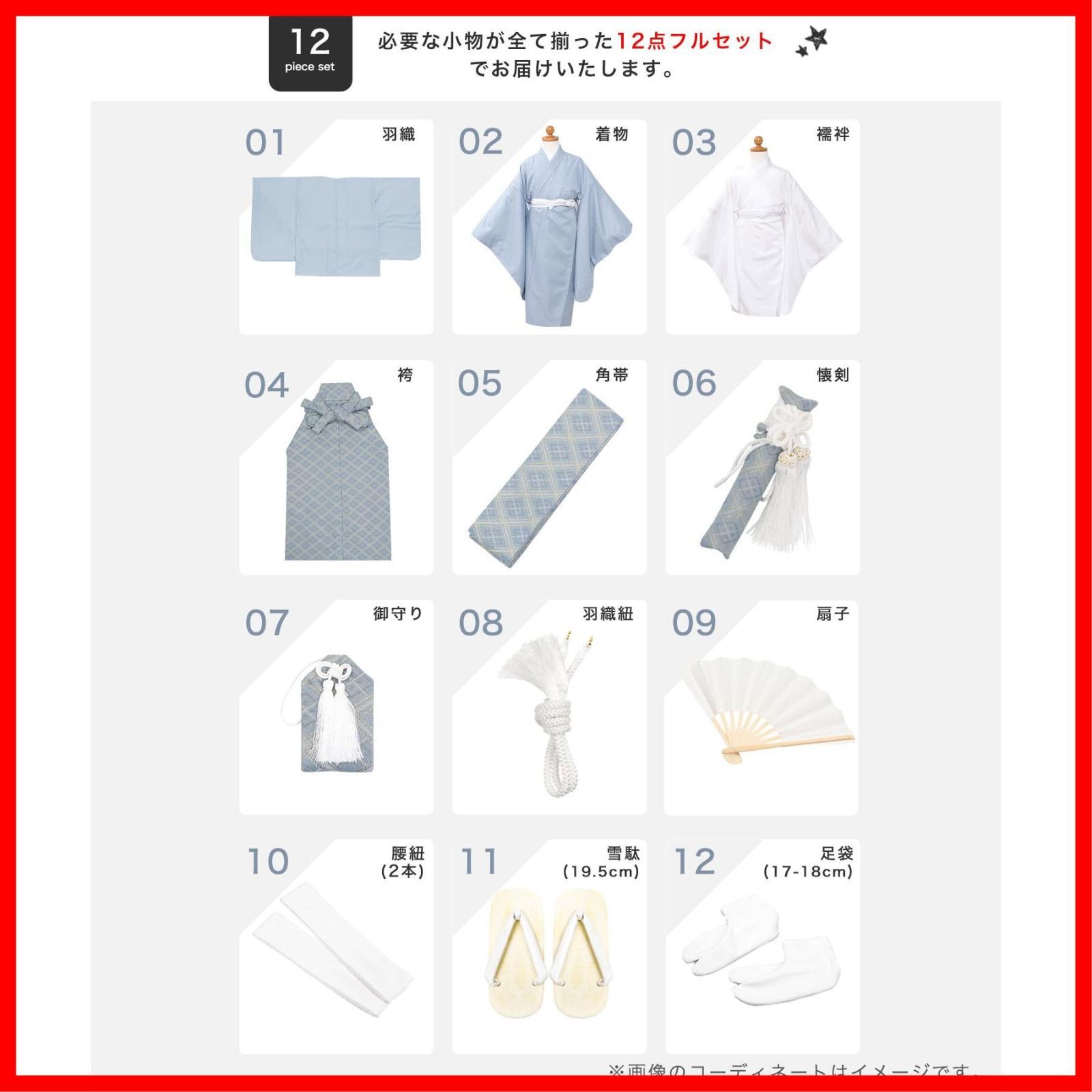 [セット内容]:着物/羽織/縞黒袴/襦袢/履物/角帯/扇子/懐剣/羽織紐/お守り/足袋/腰紐2本/着付け説明書 [品質と素材]:ポリエステル100%、[生産国]:中国