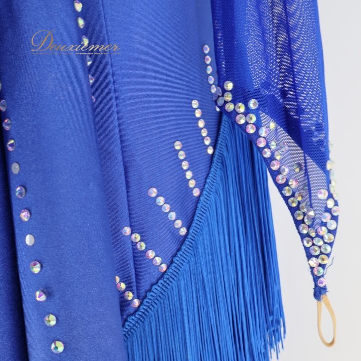 社交ダンス 衣装 ラテン ドレス ワンピース ラテンドレス 青 ブルー系 フリンジ デモ 競技 ダンス パーティ 発表会 おしゃれ デザイン 揺れる 競技衣装 発表会衣装 ステージ衣装 ラテンダンス ダンスウェア 競技用衣装 パーティードレス