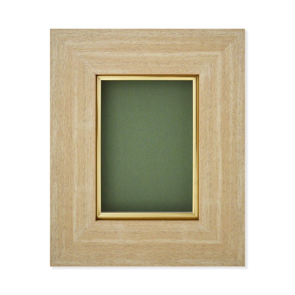 フレームはナチュラル(木地)色の幅広の樹脂製で、内側に面金ライナーを入れ、表面部分にはアクリル板を使用。