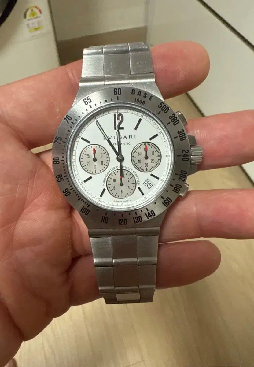 これはBVLGARI (ブルガリ) プロフェッショナルクロノグラフ 40mm ホワイトウォッチです。写真でわかるように、時計状態は良好です。すっきりとしたデザインはどんな服装にもぴったりです。