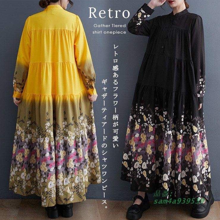 大きいサイズ レディース 花柄ワンピース ティアードワンピ オーバーサイズ 長袖 LL 秋 新入荷 イエロー 春夏 3 L 6 ブラック 4 マキシ丈 5 可 am a 939539