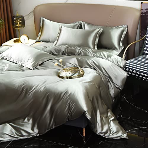 セミダブル_シルバー GraceVally Premium商品 布団カバーセット 掛け布団カバー 4点セット 寝具カバーセット 冷感 かけ布団カバー ツルツル ふとんかばー ボックスシーツ 光沢 シルク 無地 おしゃれ セミダブル グレイ
