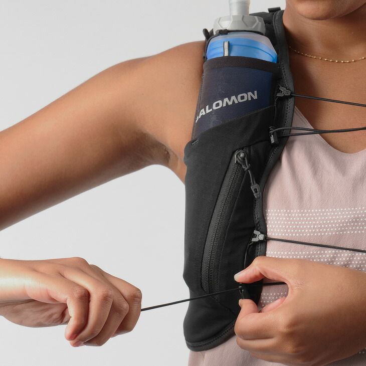 Salomon のソフトフラスクにフィットし、弾みを抑えたフロントポケット。