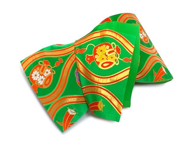七五三 袋帯 正絹 桐生織 こども ジュニア用 全通の女の子用祝帯 仕立て済み 緑 立涌に宝 JFS 591