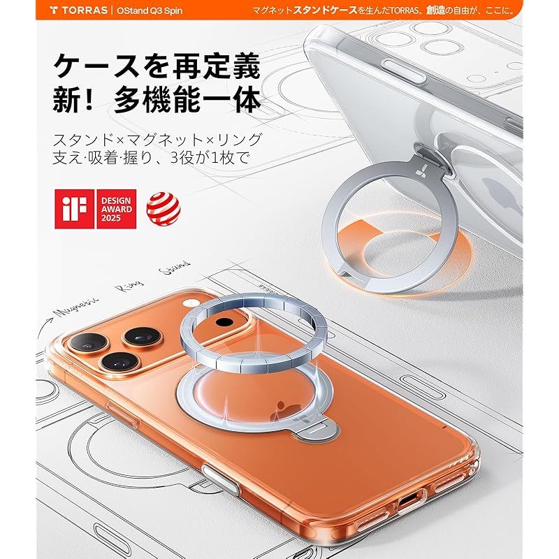 商品名:TORRAS iPhone 17 Pro 用 ケース【多機能一体・360°新定点回転スタンド】 Magsafe対応 カメラコントロールボタン 高耐久性 耐衝撃 ゼンマイ式スタンド リング 縦横両対応 マグネット搭載 急速充電対応 指紋防止「Ostand Q3