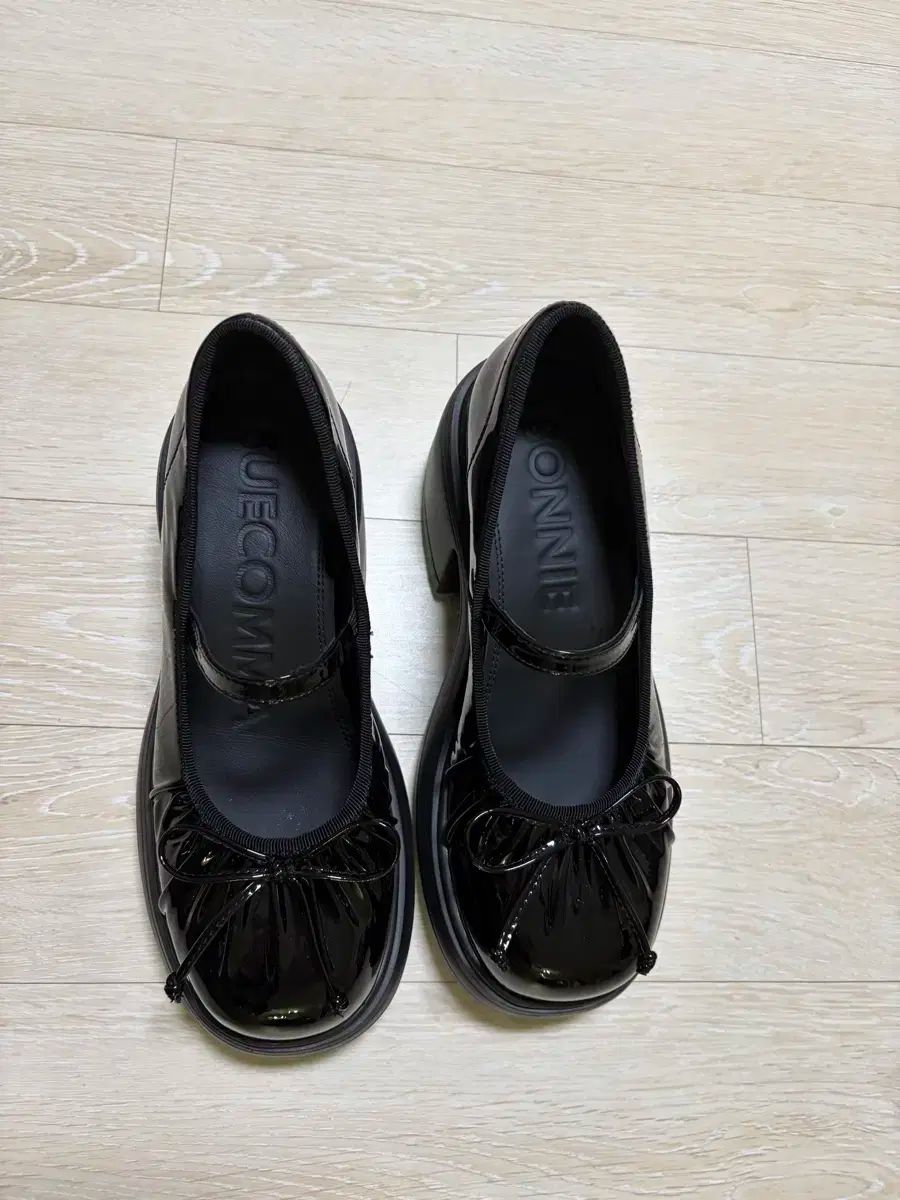 シュコマ・ボニーのメアリー・ジェーン・シューズです。ブラックエナメル製で、つま先のリボンのディテールがかわいらしさを添えています。ヒールは約6cmで履き心地がいいです。