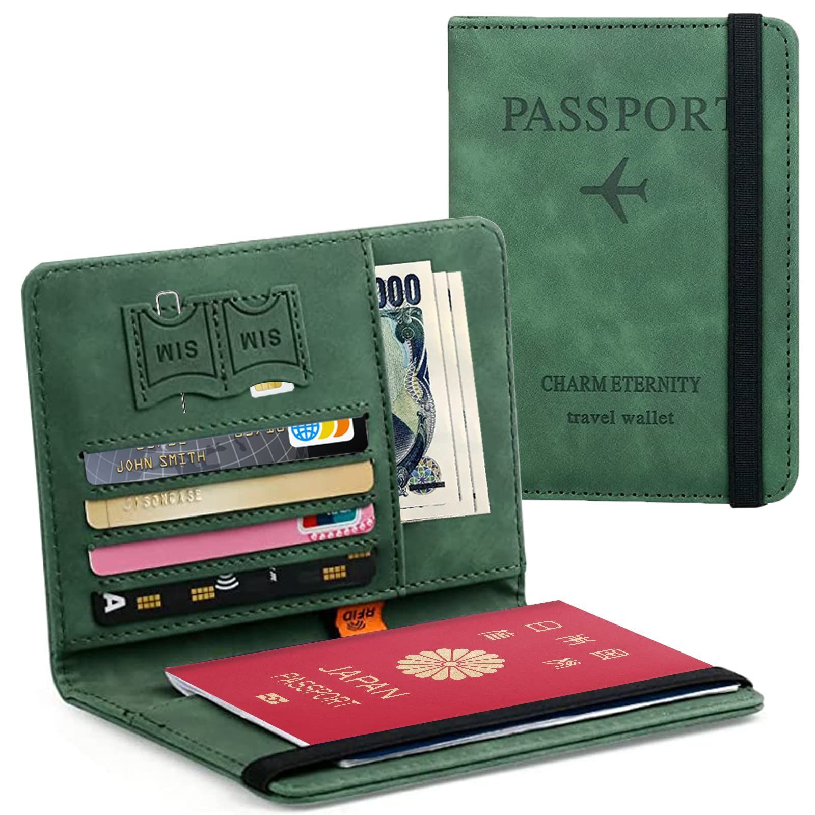 [Hueapion] パスポートケース スキミング防止 パスポートカバー 多機能収納ポケット パスポート カードケース ラベルウォレット 高級PUレザー 軽量 コンパクト おしゃれ 海外旅行 旅行用品 透明パスポートカバー付き (グリーン)