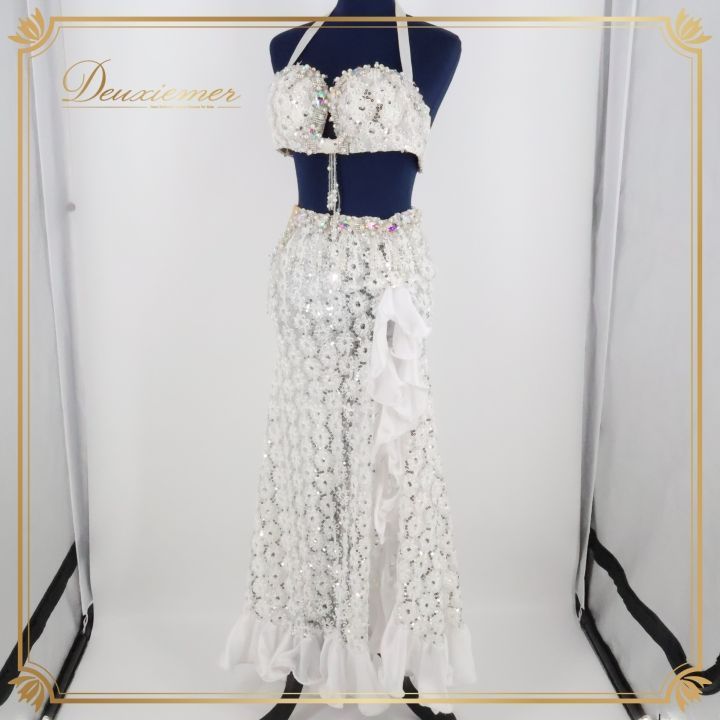 ベリーダンス オリエンタル 衣装 上下セット ホワイト系 白 シルバー 花柄 スパンコールラメ ラインストーン 装飾 レース フリル 舞台 発表会 イベント ダンス衣装 セットアップ スカート トップス シルバー系 豪華 キラキラ ラメ入り おしゃれ