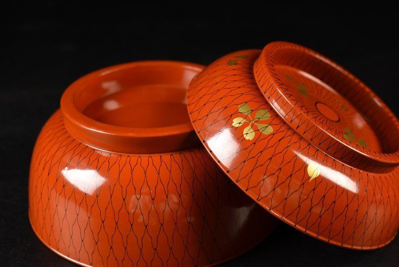 蔵A 3616 c 木製朱塗 網目文桜蒔絵 菓子椀 蓋物 十客