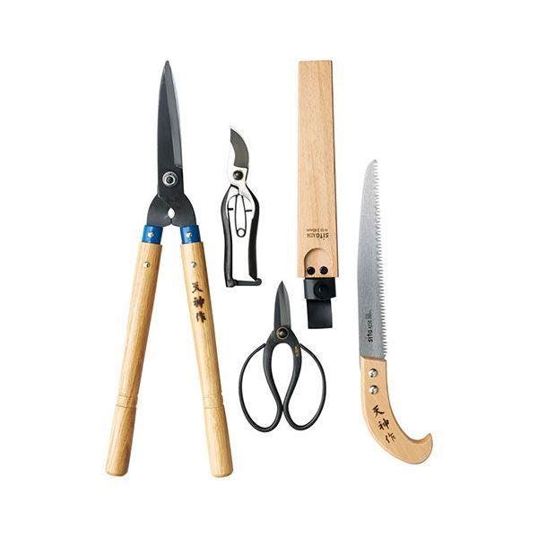 材質:刈込鋏・鞘付鋸…(刃部)刃物鋼・(柄部)天然木、剪定鋏・植木鋏…(刃部)刃物鋼・(柄部)軟鉄