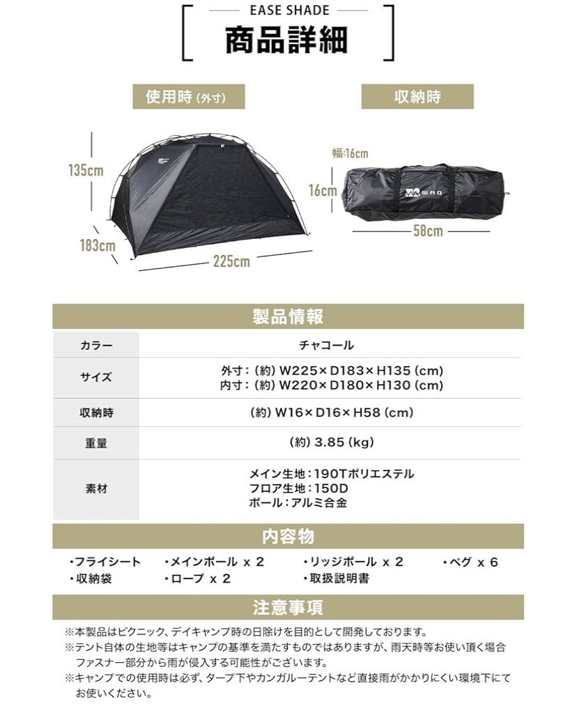 WAQ EASE SHADE 日除けシェード 簡易テント サンシェード チャコール